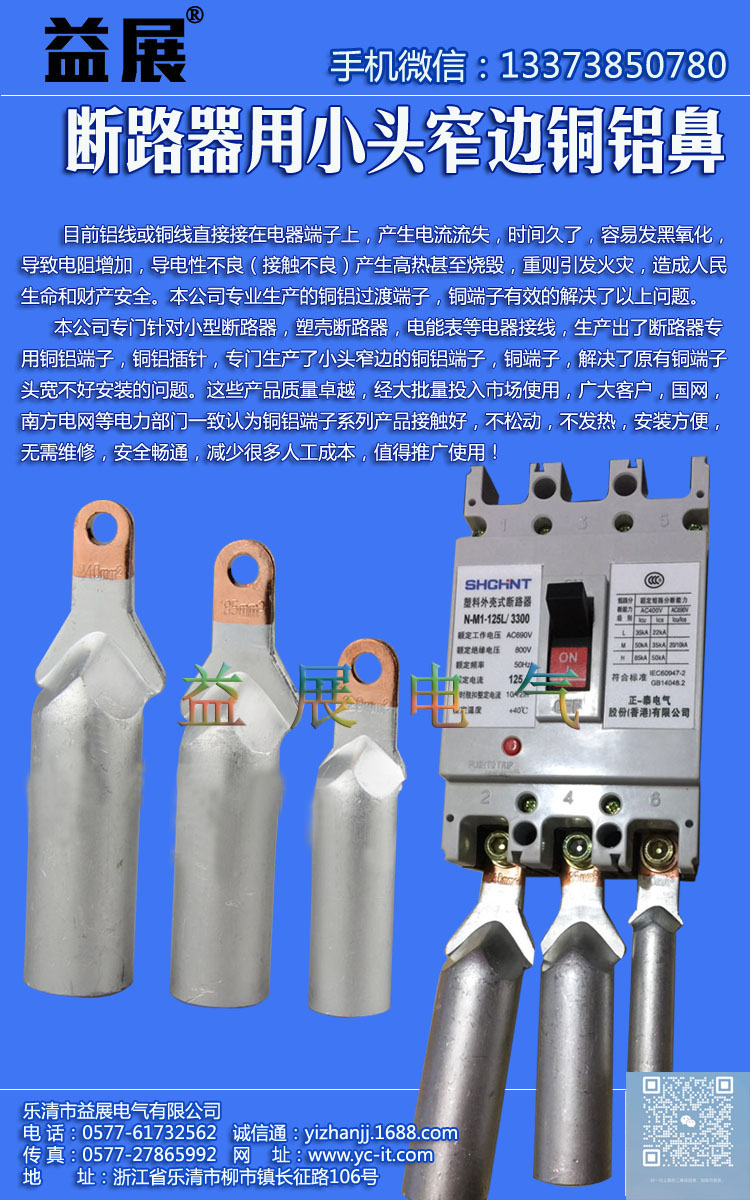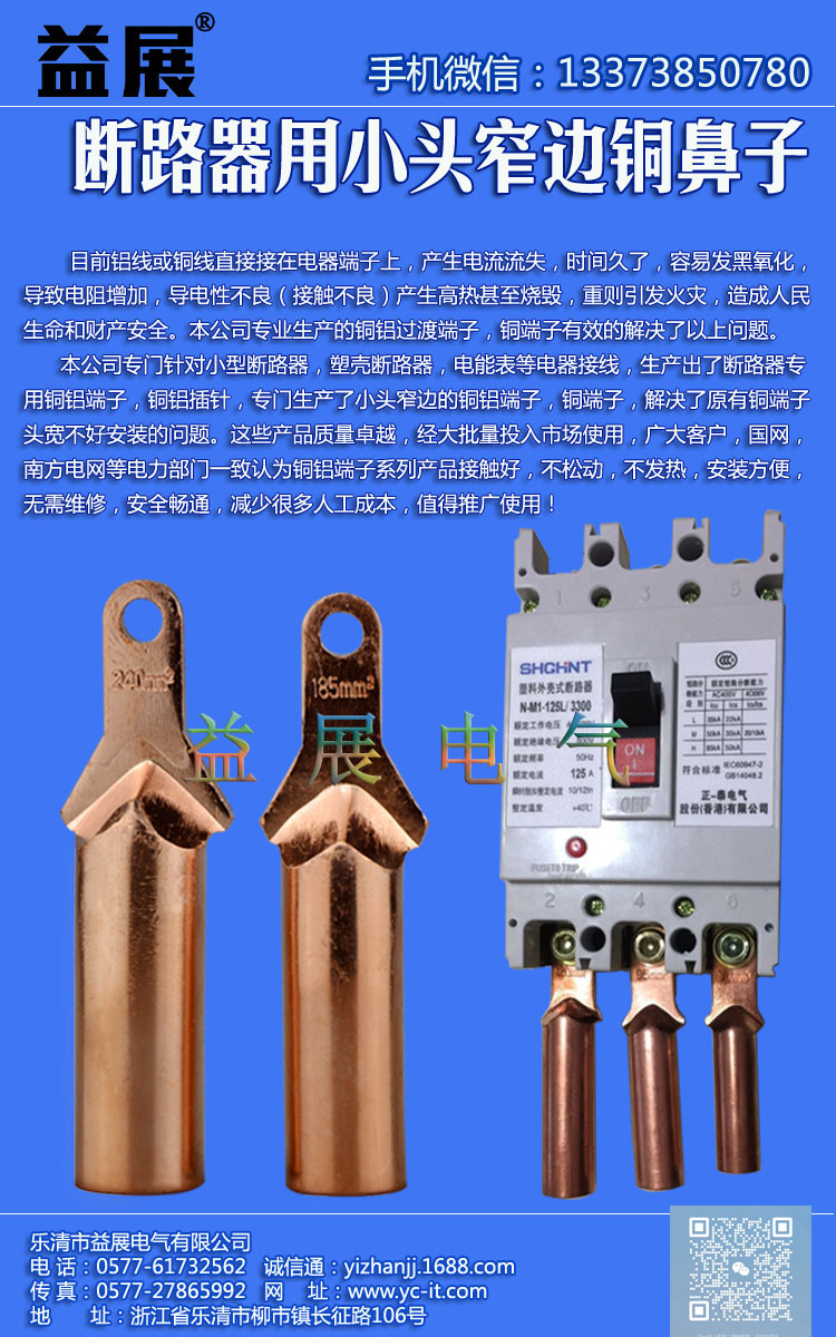 斷路器專用銅鼻子,DTX-35鍍錫銅鼻子,窄頭銅鋁線鼻子,益展電氣專業(yè)生產(chǎn)各種銅鼻子,雙孔銅鼻子,銅鋁過(guò)渡線鼻子,SC窺口線鼻子,雙孔銅鋁鼻子,冷熱縮電纜附件,穿刺線夾,堵油銅鼻子,冷壓端子,C45插針,OT開口鼻子,管型冷壓端頭,銅鋁線夾,接線端子,接插件,壓線帽,等各系列配線器材。廠家直銷,價(jià)格優(yōu),質(zhì)量高。歡迎與各界人士合作。